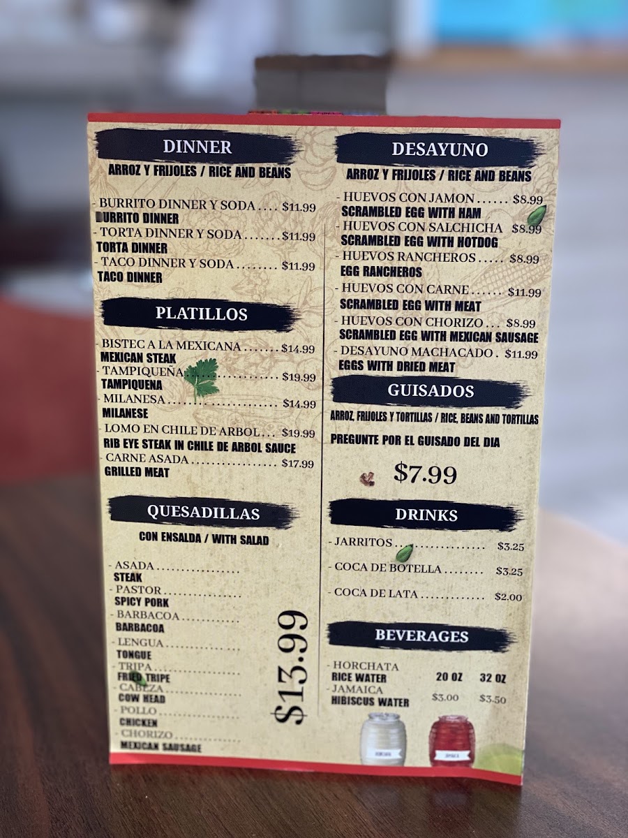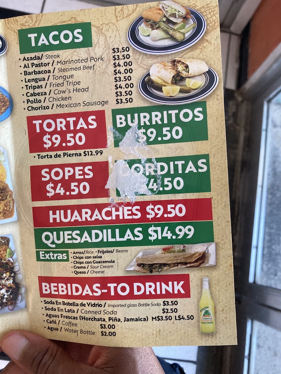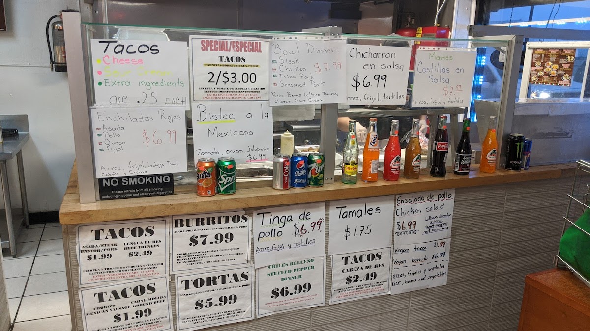 For those seeking something more substantial, the Especial Tacos Mexicana is a must-try, offering a special twist on the classic taco. The menu also features a diverse selection of beverages, including Soda En Botella De Vidrio (bottle sodas), Soda En Lata (can sodas), and refreshing Aguas Frescas that pair perfectly with the savory tacos. For coffee lovers, Café is available to enjoy alongside your meal, while Agua (water) is also offered for a more neutral refreshment.